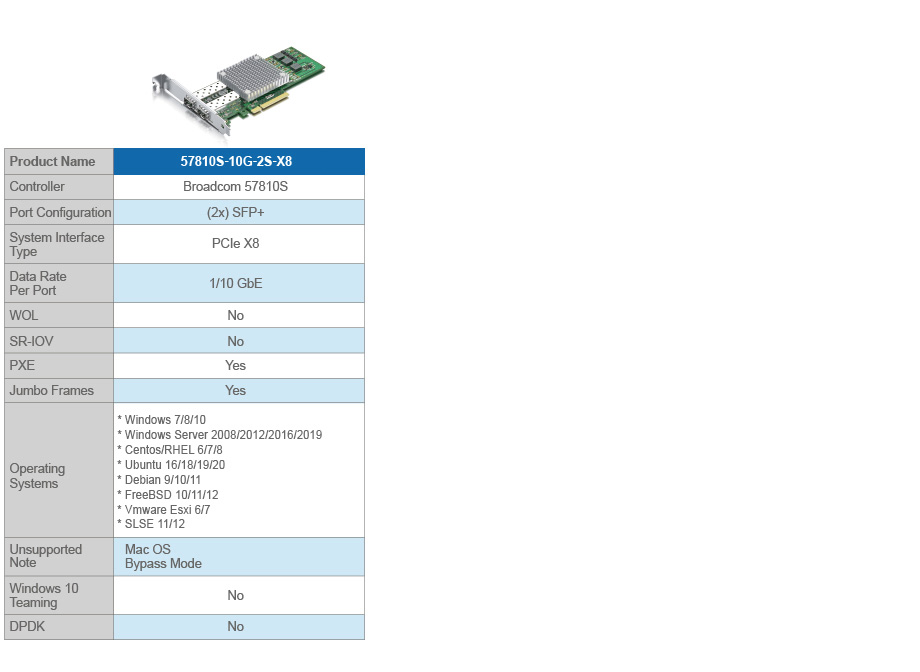 57810S-10G-2S-X8 | 10Gb/s | Broadcom 57810S | 2 x SFP+ | Broadcom BCM57810S | Download(Linux) Download(Windows) |