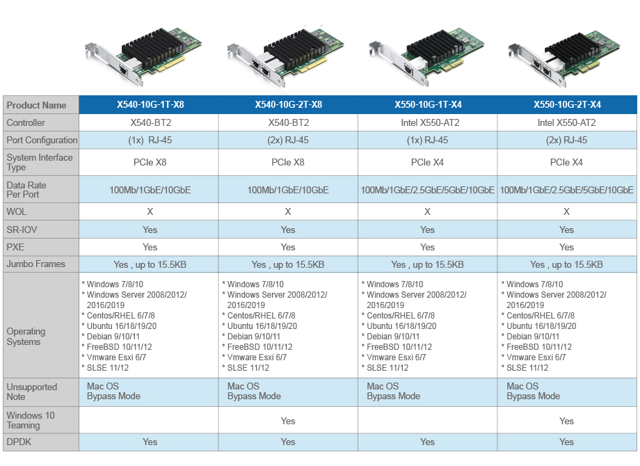 X550-10G-1T-X4 | 10Gb/s | Intel ELX550AT | 1 x RJ-45 | Intel X550-T1 | Download |
